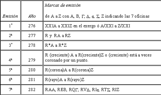Desde un punto de vista cuantitativo, la importancia de las emisiones es media y relativamente constante, salvo la sexta emisión que representa ella sola más del 50 % de la producción. Esta sexta emisión coincidió con la presencia del emperador en Roma y con el triunfo que celebró por las calles de la Urbs. Son verdaderamente notables los bustos y los reversos presentes en las monedas acuñadas para esta ocasión.