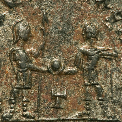 En cuanto a la descripción del reverso, compartimos la opinión de Christophe Oliva y consideramos que es Marte y no un soldado quien entrega un globo a Probo, como, a nuestro juicio erróneamente, dice P. Webb, autor del Volumen V-II de RIC, quien si embargo sí lo identifica como Marte al describir el reverso similar del tipo de Aureliano acuñado por el mismo taller en 275 dC (RIC 366). Y es que esta emisión, oportuna sin duda, no es original en cuanto al tipo elegido, que ya había sido utilizado en el reinado de Aureliano, gran promotor -por otra parte- de la política sobre el dominus que seguirá también Probo, y a la cual cuadra mucho mejor que sea Marte, dios de la guerra, quien entrega el símbolo del poder sobre el orbe al soberano. Pero esta es otra historia, de la que nos ocuparemos en otro momento.